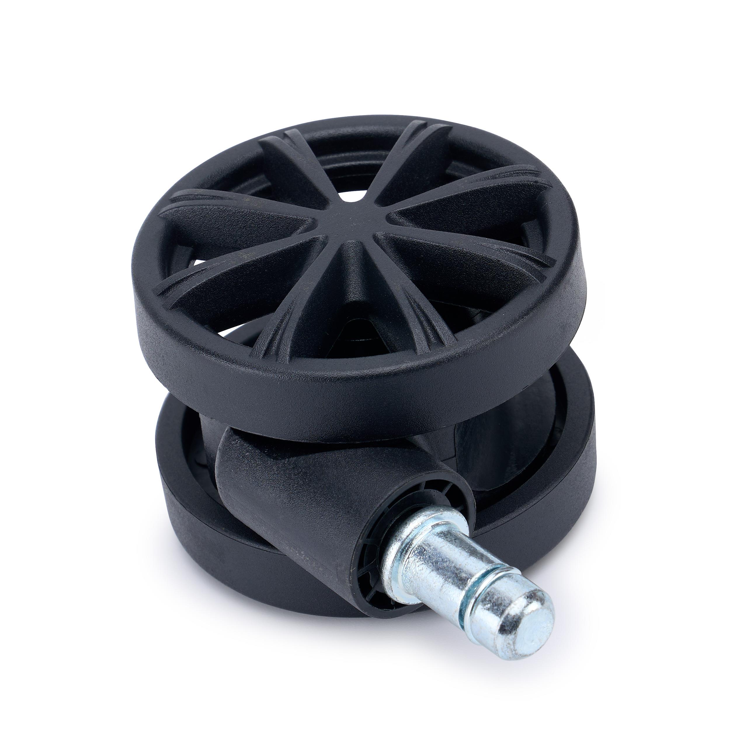 Lot de 5 roulettes pour chaises de bureau SPOKE. Ces roulettes se distinguent par leur design moderne et élégant, caractérisé par une structure à rayons fins et dynamiques qui apporte une grande légèreté visuelle et un style résolument contemporain. Leur couleur noire uniforme et leurs lignes épurées en font un élément esthétique raffiné, capable de valoriser n’importe quelle chaise de bureau, qu’elle soit directionnelle ou opérationnelle.