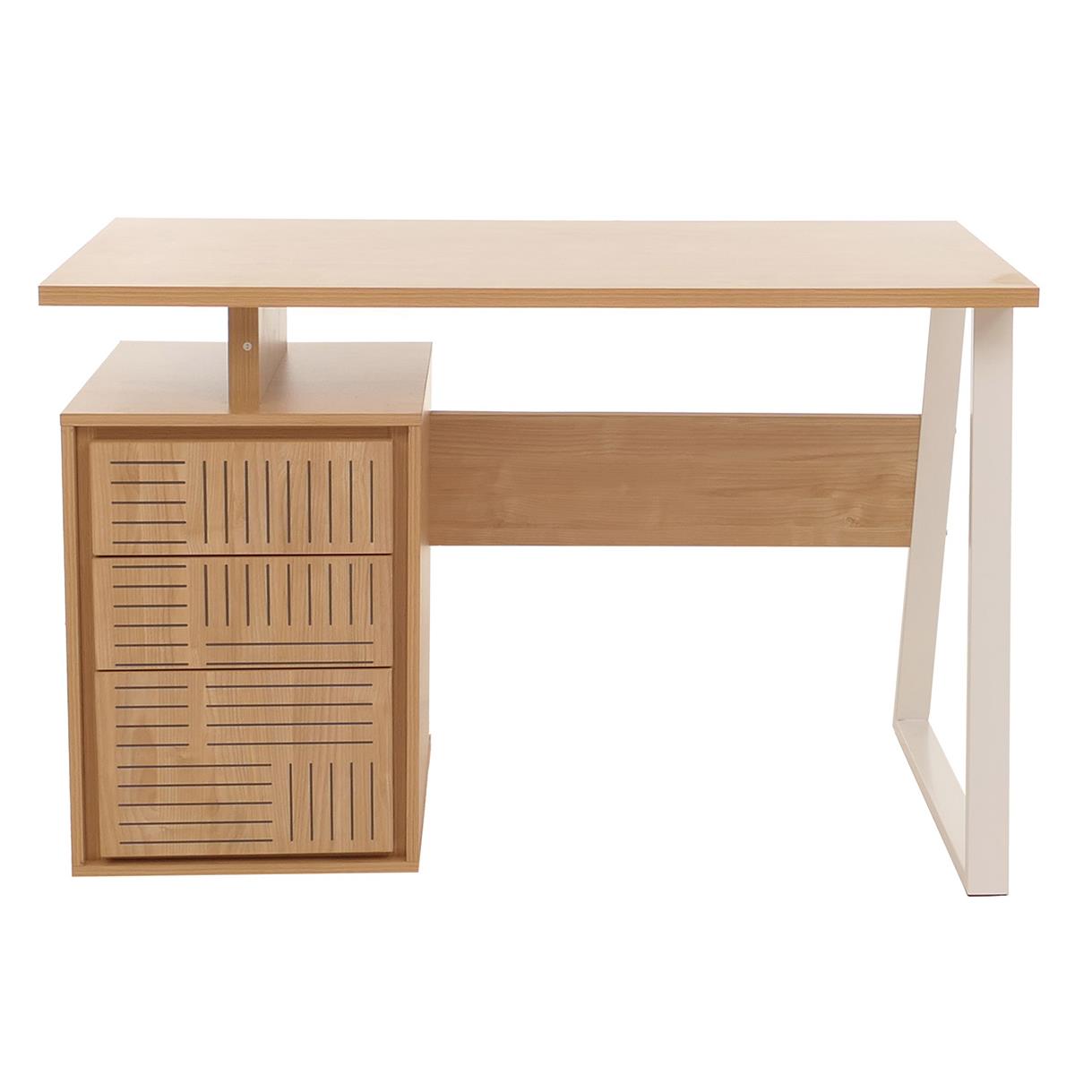 Côté fonctionnalité, ce modèle se caractérise par sa grande surface de travail de 118 cm de largeur et 58 cm de profondeur, offrant l’espace idéal pour travailler confortablement. Il dispose également de trois tiroirs avec système d’ouverture par pression, permettant un accès facile sans poignées, pour ranger documents, fournitures de bureau ou appareils électroniques de manière ordonnée.