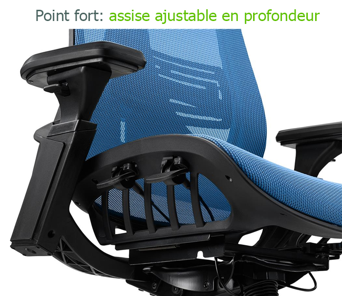 L’assise de la chaise, ergonomique, est ajustable en profondeur, cette caractéristique est la garantie d’un confort optimal. Le maniement de cette fonction est simple et intuitif, l’idéal pour adapter au mieux le produit à l’ergonomie de son utilisateur. Le revêtement est en maille respirable, un matériel qui favorise à la fois une meilleure circulation de l’air et de la circulation sanguine. Vous pourrez ainsi utiliser ce produit jusqu’à 8 heures par jours, sans aucun problème.