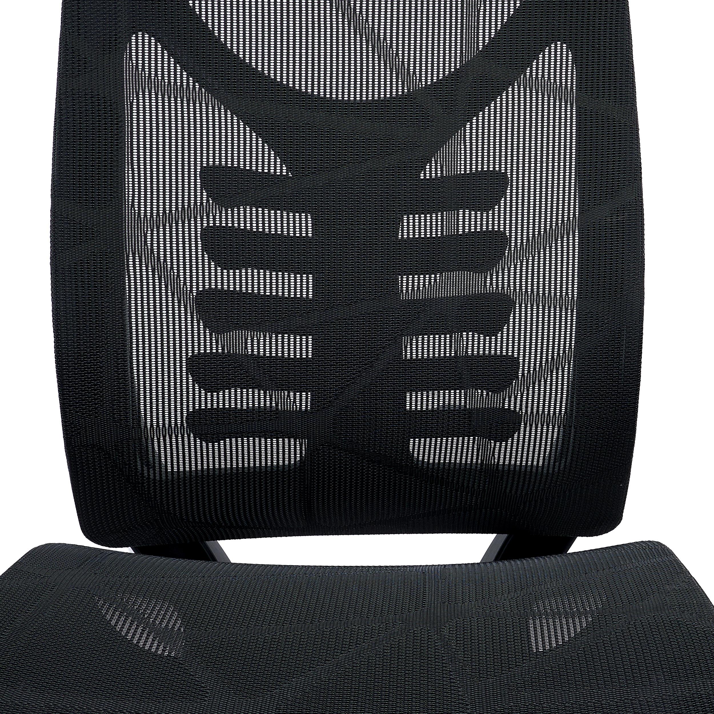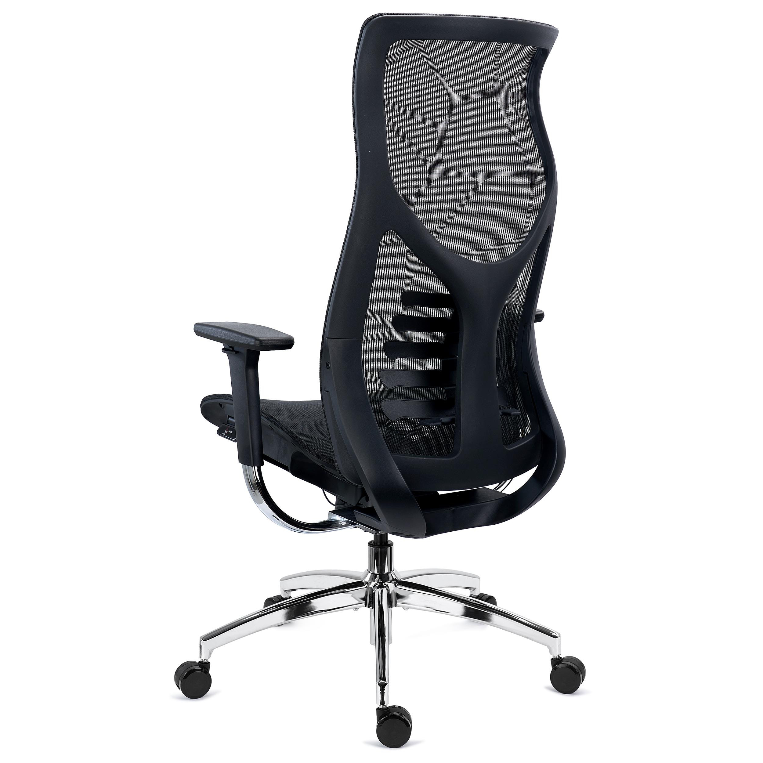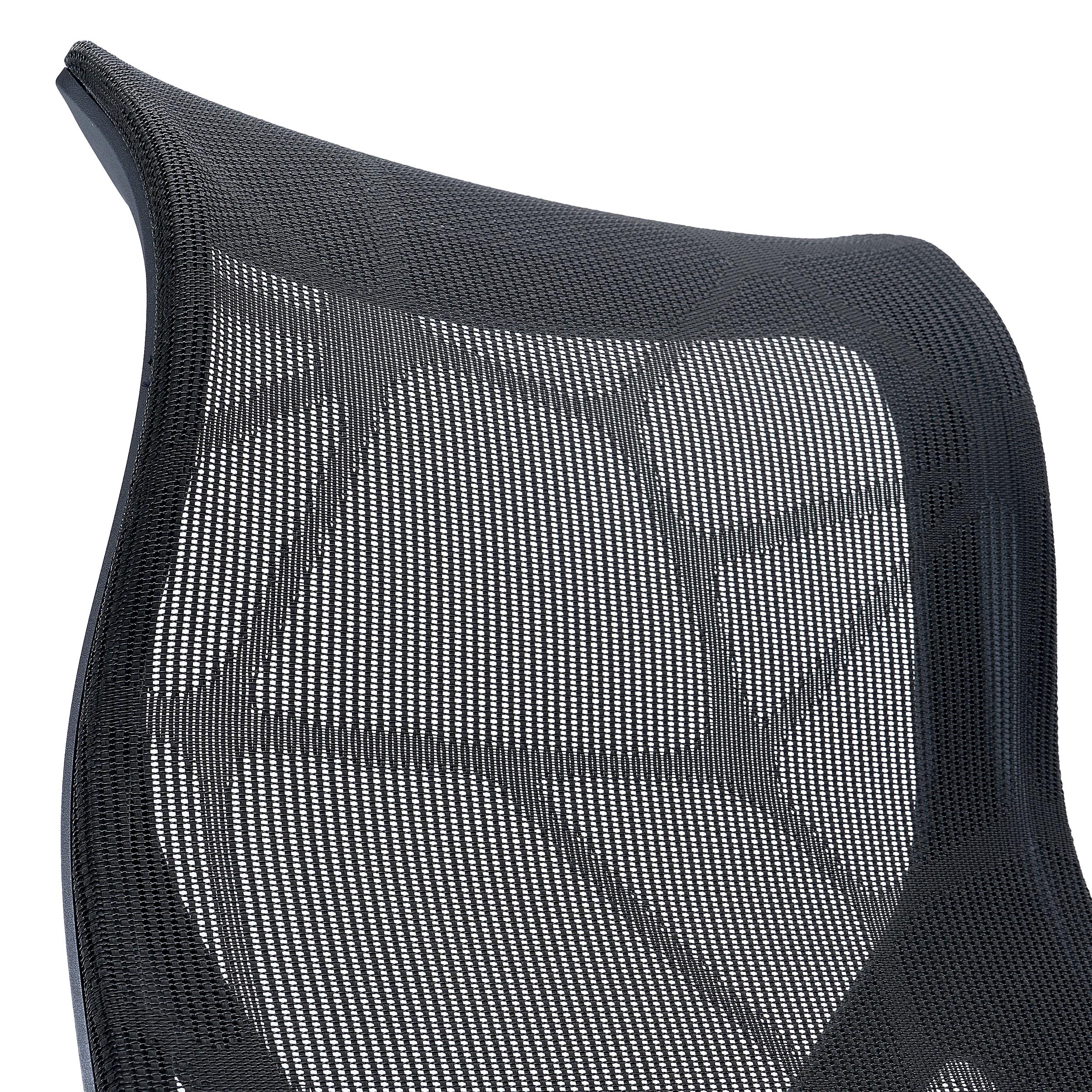 Comme vous le constatez sur les photos, le dossier haut ergonomique de ce modèle qui intégre l'appui-tête est revêtu de maille et comprend un support lombaire réglable en hauteur. Par ailleurs, la forme du soutien lombaire est singulière puisque ce support s'étend au-delà du bas du dos. Cette finition donne à l'ensemble une apparence sophistiquée et assure un confort optimal.