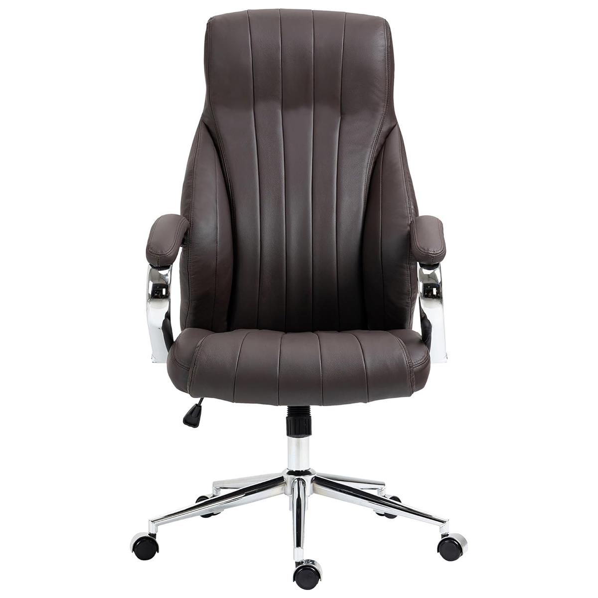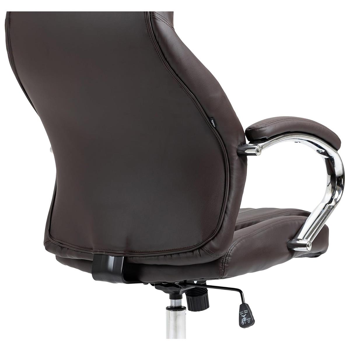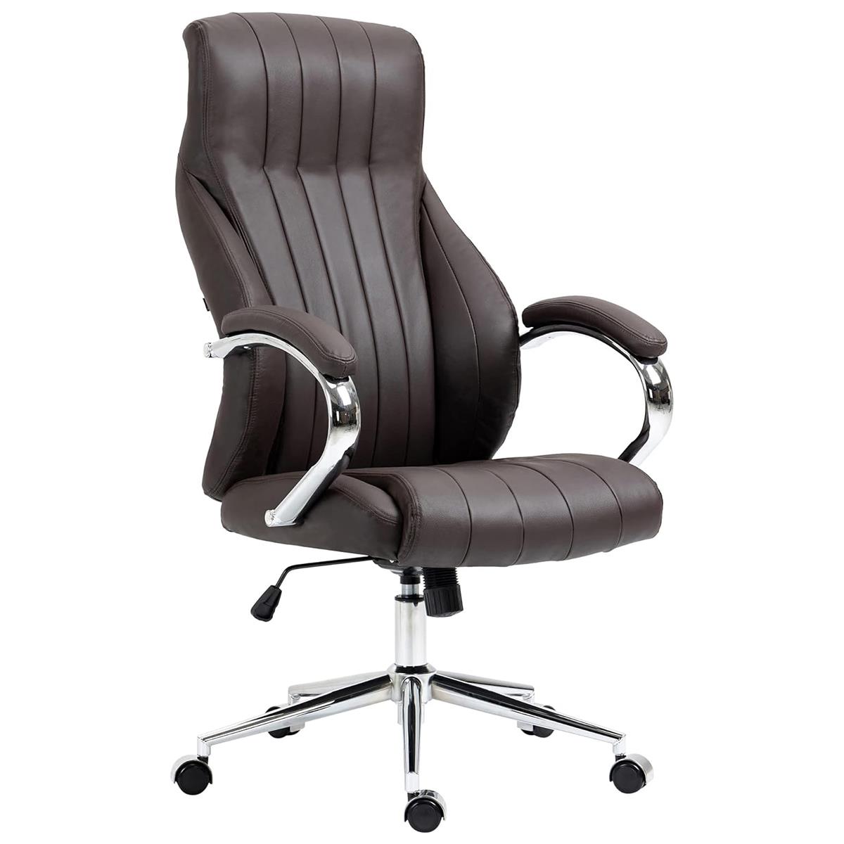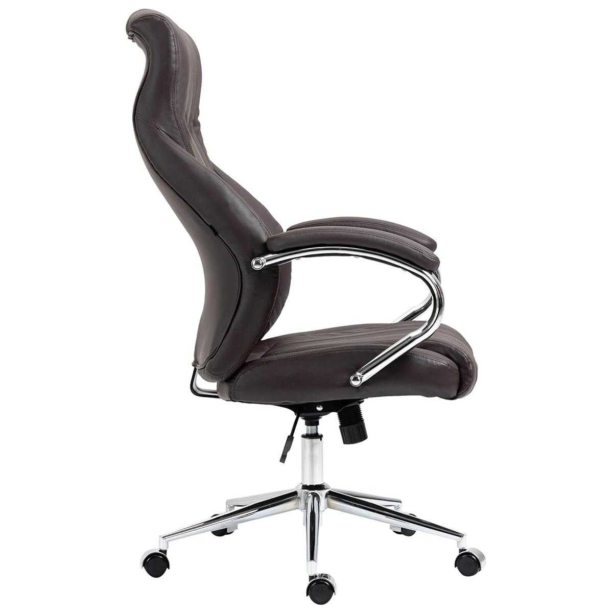 Ce fauteuil de direction se distingue par son dossier haut et ergonomique, qui soutient le dos et favorise une bonne posture. L'assise et le dossier sont généreusement rembourrés pour un confort optimal tout au long de la journée. Les accoudoirs sont rembourrés sur le dessus et dotés d’une structure solide en métal chromé, ils allient confort, stabilité et élégance.