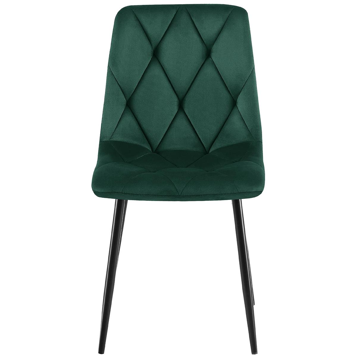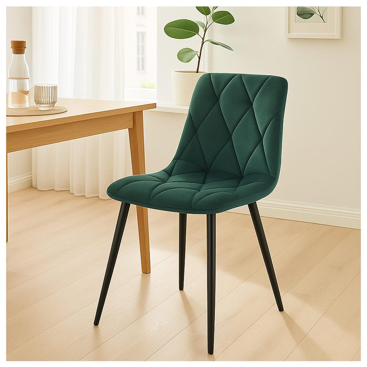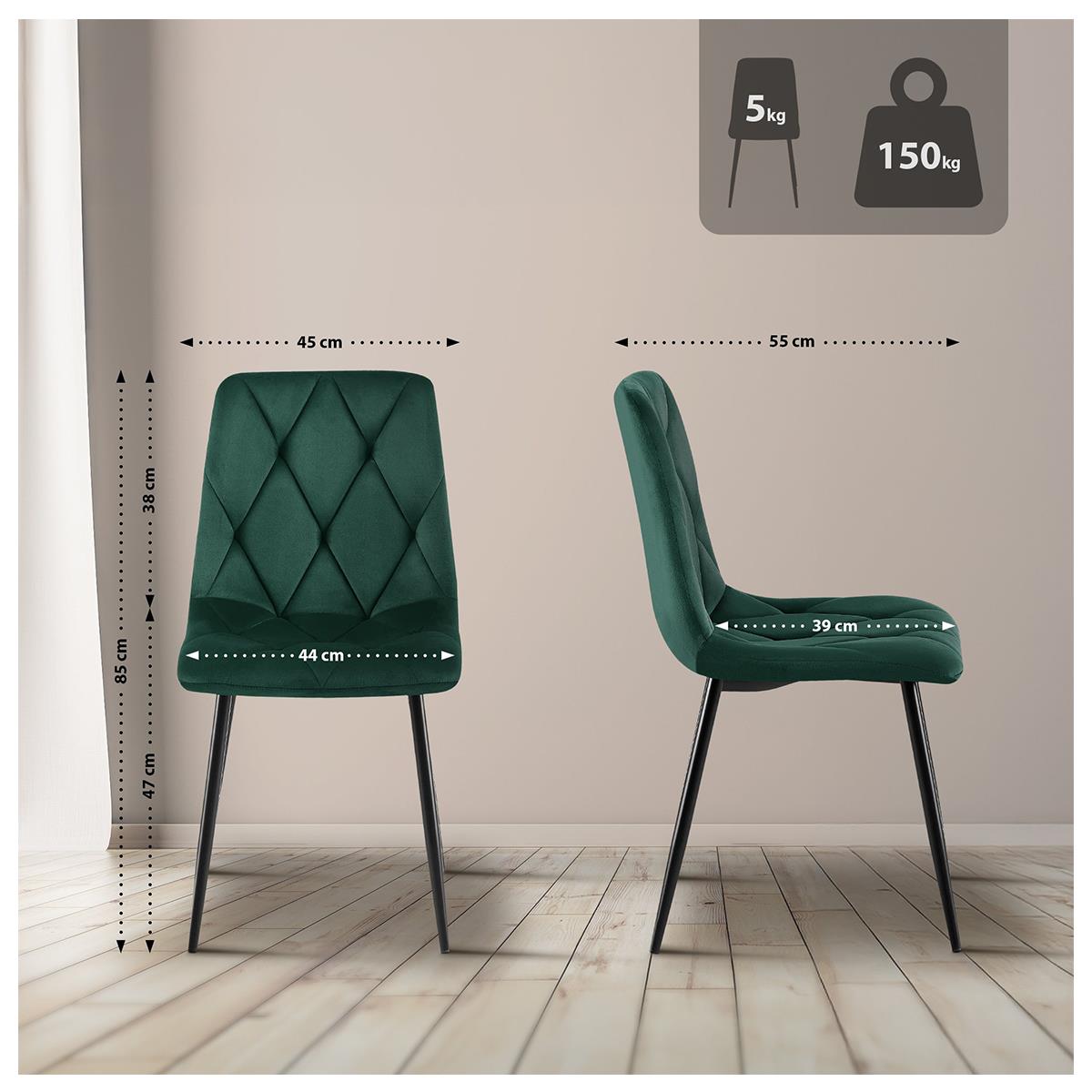 Fabriquées à partir de matériaux de haute qualité, ces chaises garantissent durabilité et résistance. Le revêtement en velours apporte une touche luxueuse et une sensation très agréable. Les pieds métalliques noirs assurent une stabilité solide tout en créant un contraste élégant avec le tissu. Elles supportent une charge maximale de 150 kg et disposent de patins de protection pour préserver vos sols.