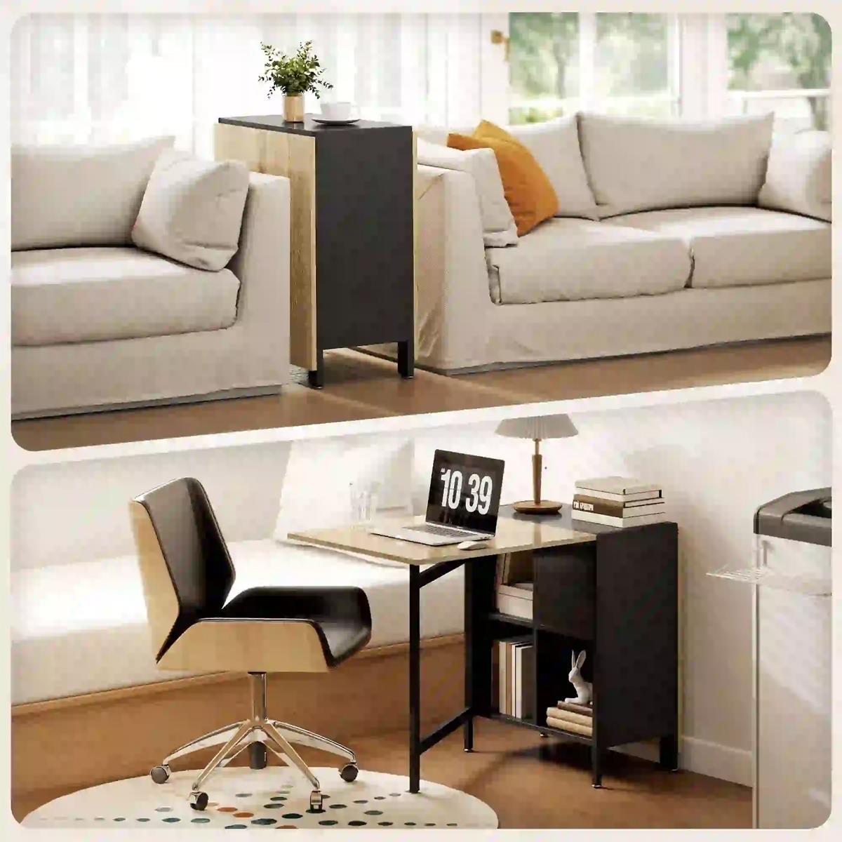 La table peut être repliée d’un côté ou des deux, et offre 3 configurations différentes selon vos besoins. Elle intègre également, en son centre, 4 compartiments de rangement pratiques, parfaits pour organiser dossiers et accessoires de bureau.