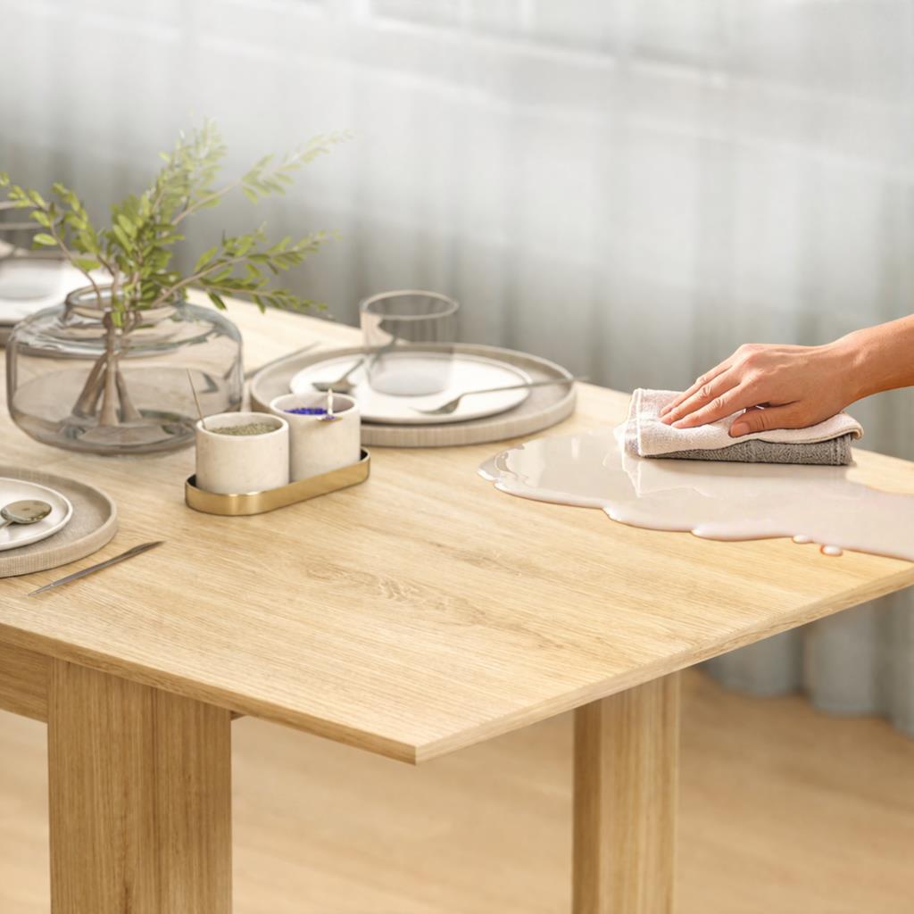 Parfaite pour différents espaces et pour un usage quotidien, la surface en bois MDF est traitée de manière à être facile à nettoyer et à entretenir. En effet, un simple chiffon humide suffit pour garder la table propre et comme neuve. Les pieds de la table sont équipés de protections afin de ne pas abîmer le sol et d’éviter les rayures, tout en améliorant la stabilité de l’ensemble de la structure.
